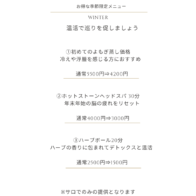 初めての方には、当サロンの施術を体験しやすい初回限定クーポンをご用意しおります。もちろんリピーター様にもお得な季節限定コースを仮説によってお楽しみいただけます。タイ伝統お腹のマッサージのゴイトーン、ハーブボール、ドライヘッドスパなど、幅広いコースが人気です。コースでお悩みの際はお気軽にご相談ください。