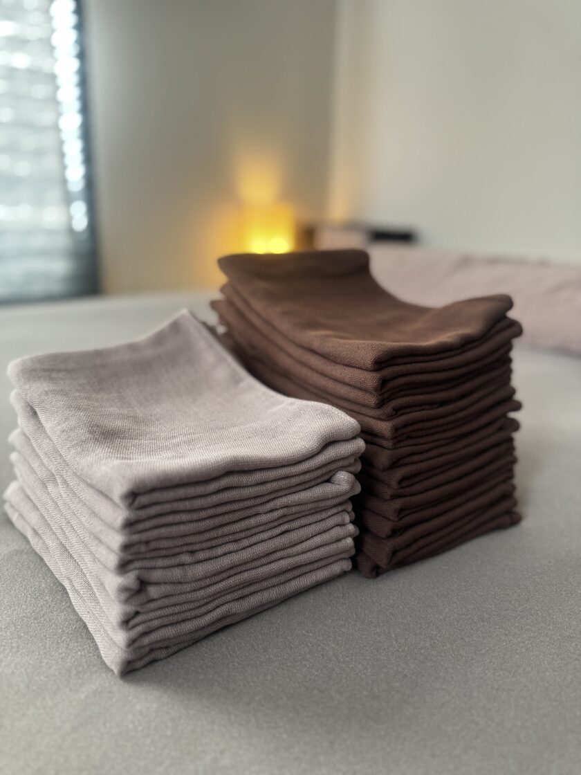 柔らかさと通気性、吸水性のバランスが優れ、施術中の心地よさを一段と高めてくれる特別なタオルです